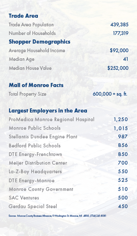 • This 600,000 square foot mall is located in a residential exurb of two large, metropolitan areas, equidistant between Detroit, Michigan and Toledo, Ohio.
